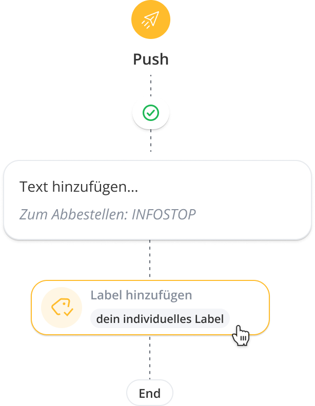 Besonders in Chatflows ist es sinnvoll, Labels automatisch zu vergeben, da diese Kontakte dann unterschiedlich weiterverarbeitet werden können. Labels können an jedem Punkt im Chatflow gesetzt werden – sei es automatisch beim Start des Flows, nach einem Klick auf einen Button oder nach der Inaktivität des Kontakts. Mit dieser Aktion wir das Label an jeden Kontakt vergeben, der diese Flowsequenz durchläuft.