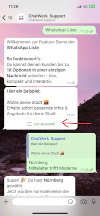 Mit der Listen-Funktion gibst du deinen Kunden bis zu 10 Auswahlmöglichkeiten in einer einzigen Nachricht. Ideal, um übersichtlich mehrere Optionen anzubieten – ohne den Chat zu überladen.