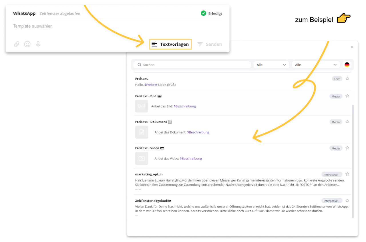 Alle Anfragen können mittels WhatsApp Textvorlagen (s.g. Templates) bearbeitet werden.