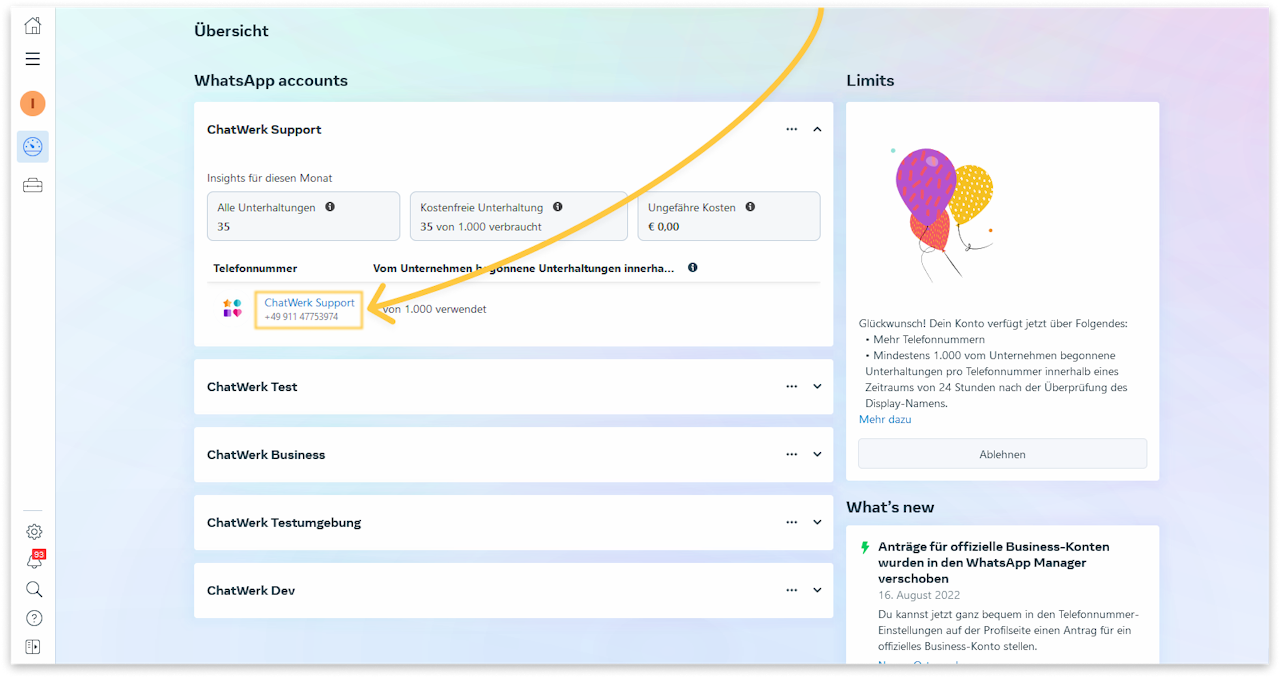 https://business.facebook.com/settingsGehe auf der linken Seite auf WhatsApp Konten